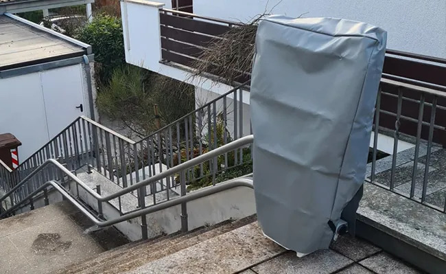 Οι εξωτερικοί ανελκυστήρες σκάλας μας διαθέτουν ένα άνετο, ανθεκτικό στις καιρικές συνθήκες κάλυμμα, για την προστασία του ανελκυστήρα σκάλας από τον πάγο, το χιόνι και τη βροχή, διατηρώντας το πάντα καθαρό και στεγνό.